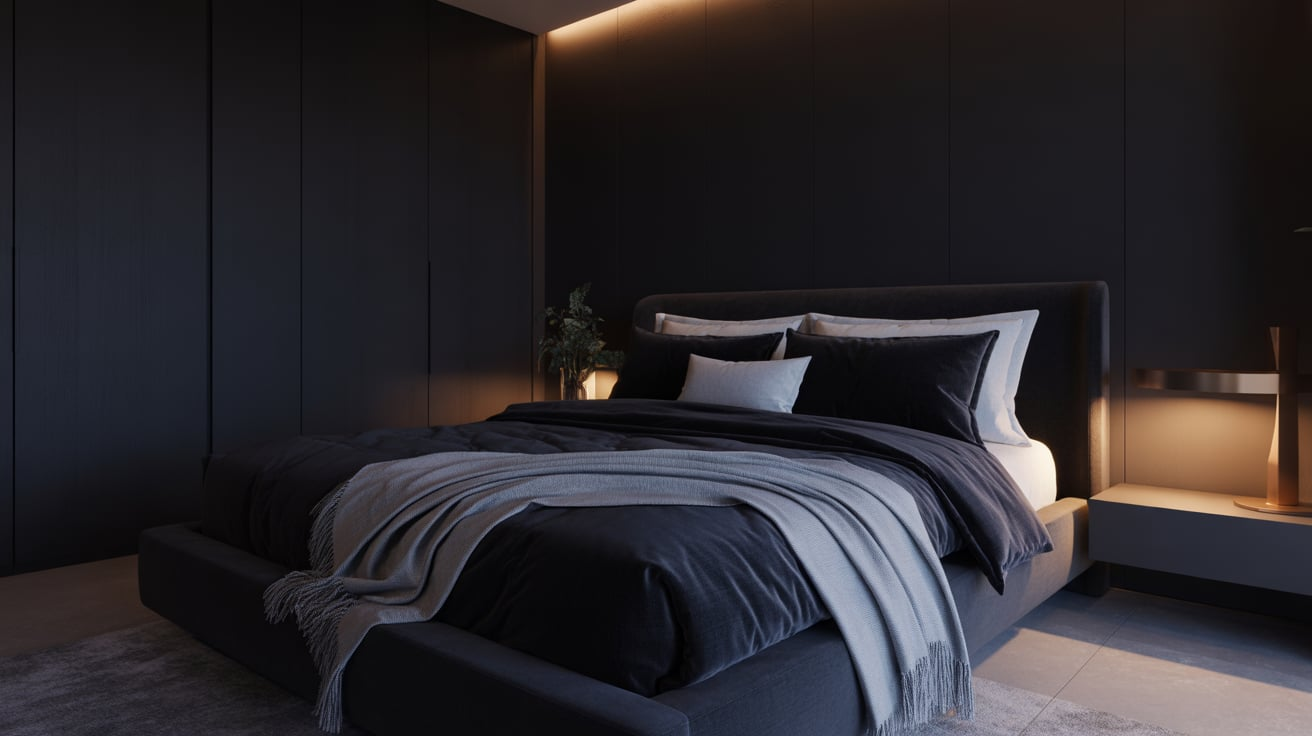 Let’s start strong — matte black walls. They absorb light beautifully, creating a cocoon-like feel that’s perfect for sleeping or relaxing. Pair them with crisp white bedding or warm wooden furniture to keep things balanced. Add a few gold or brass accents, and suddenly your room feels like a boutique hotel suite.